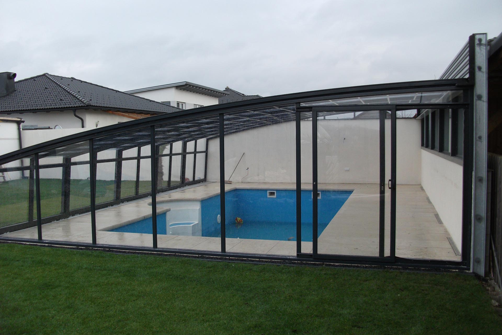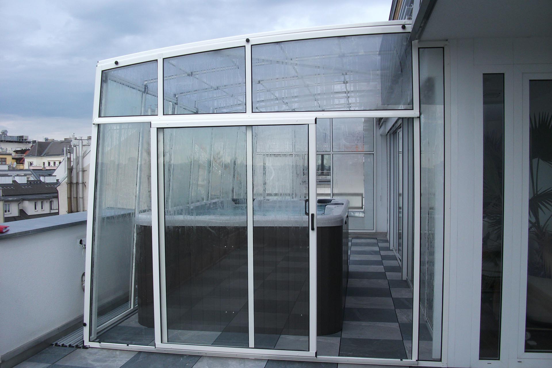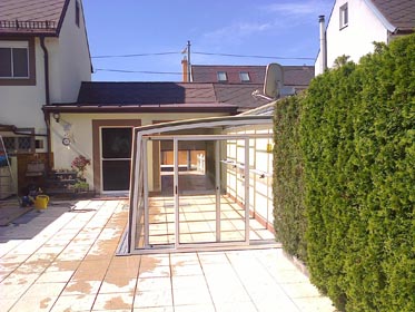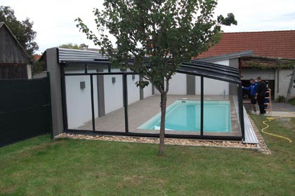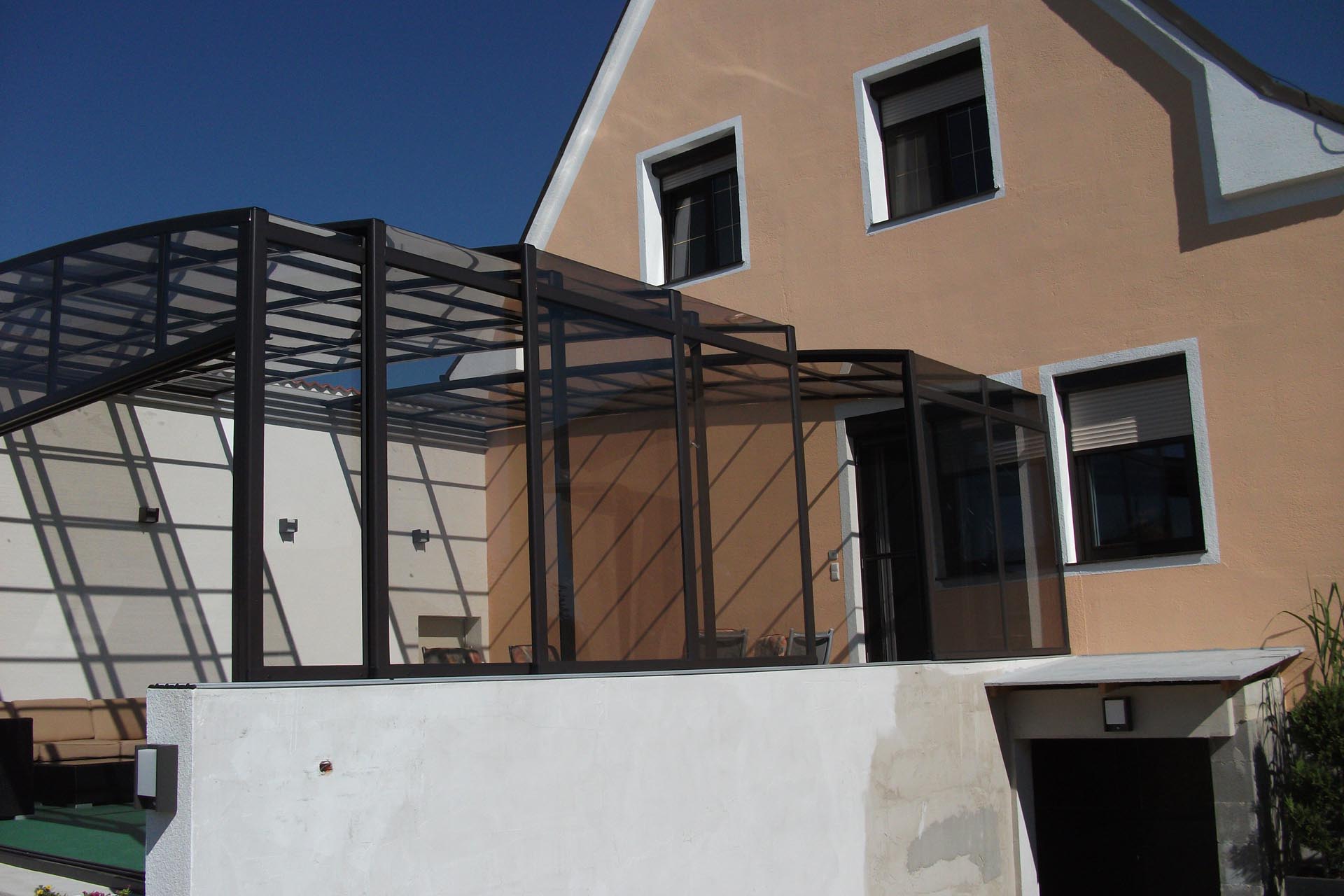 An die Wand montiert, vierteltrapezförmig, hochgebaute Überdachung.