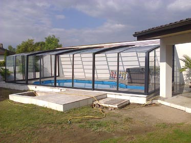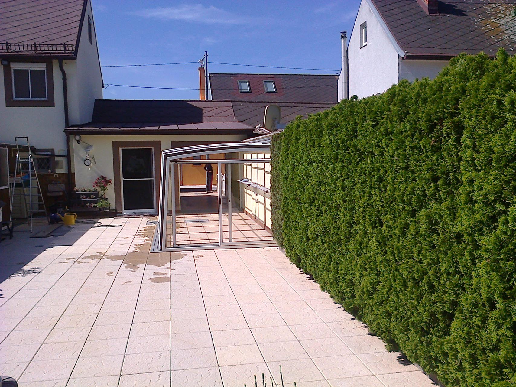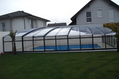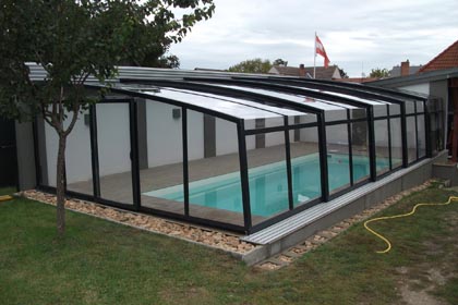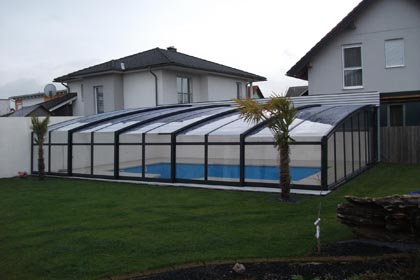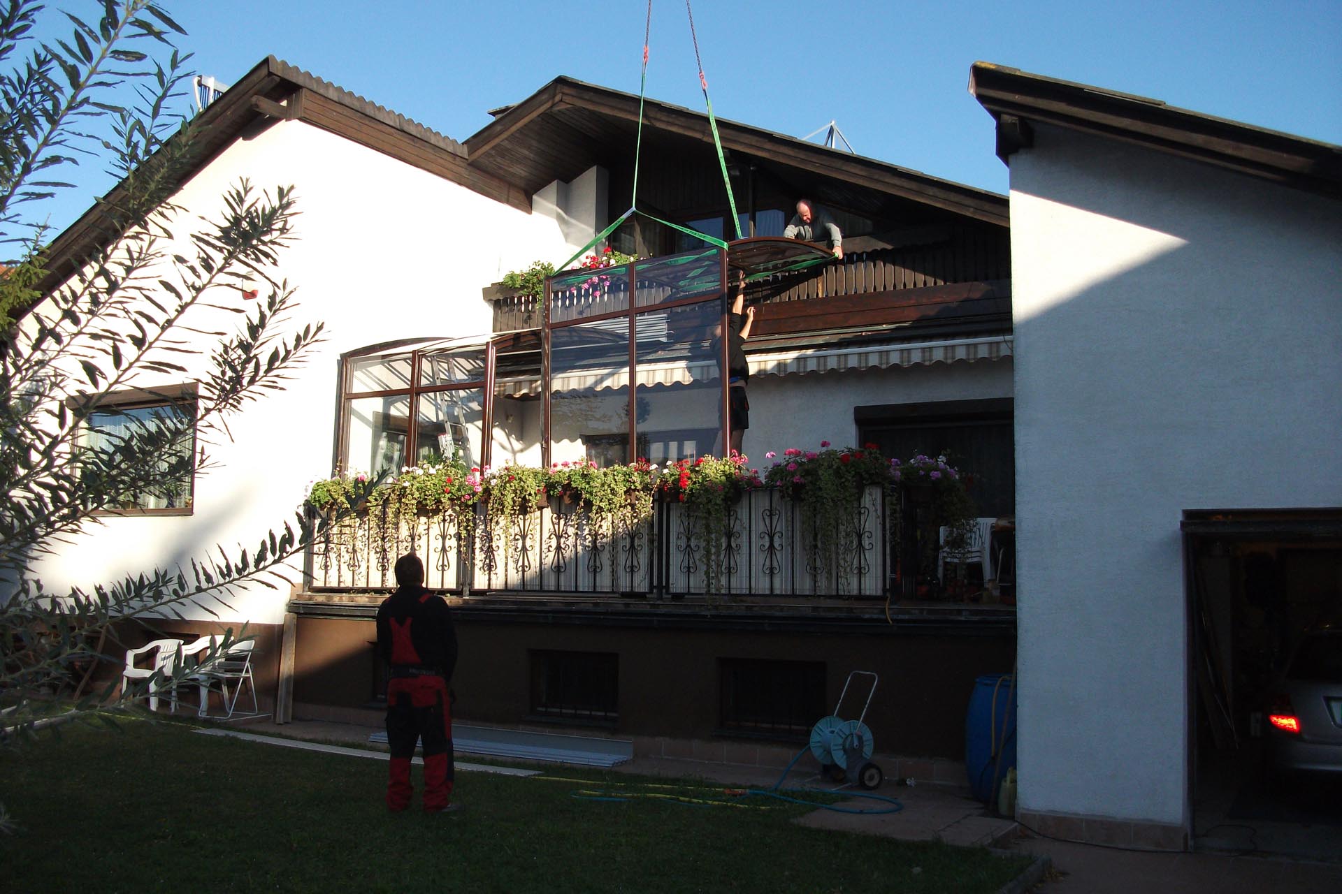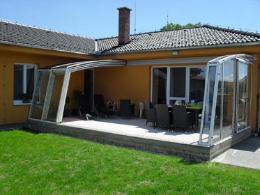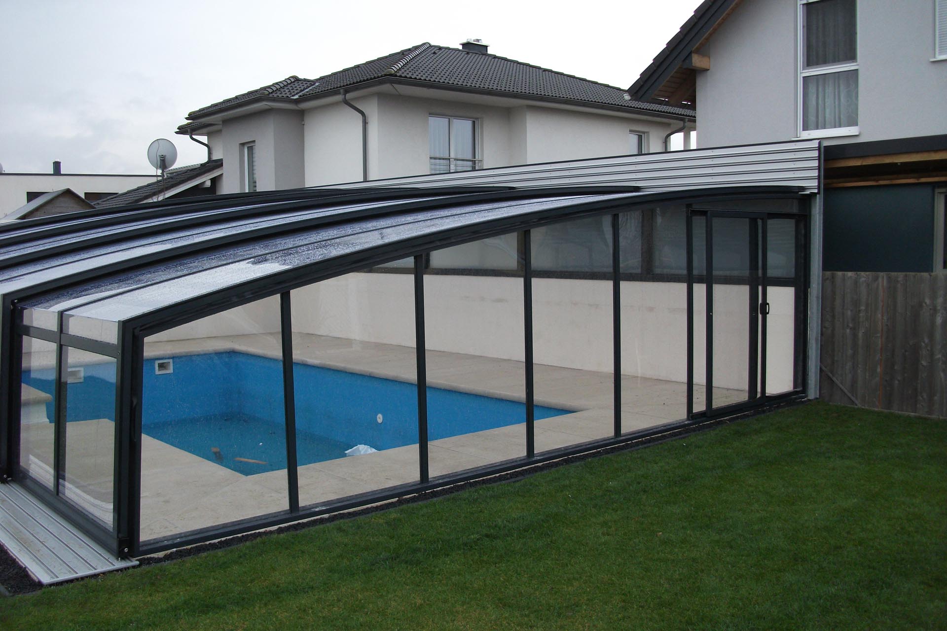 An die Wand montiert, vierteltrapezförmig, hochgebaute Überdachung.